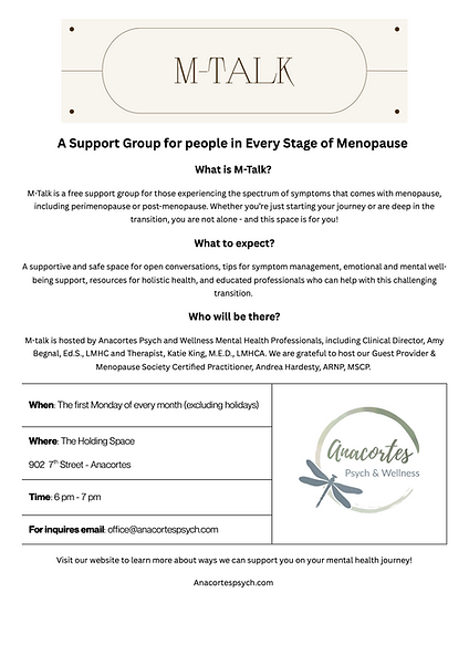 M Talk: A Support Group for People in Every Stage of Menopause meets the first Monday of every Month